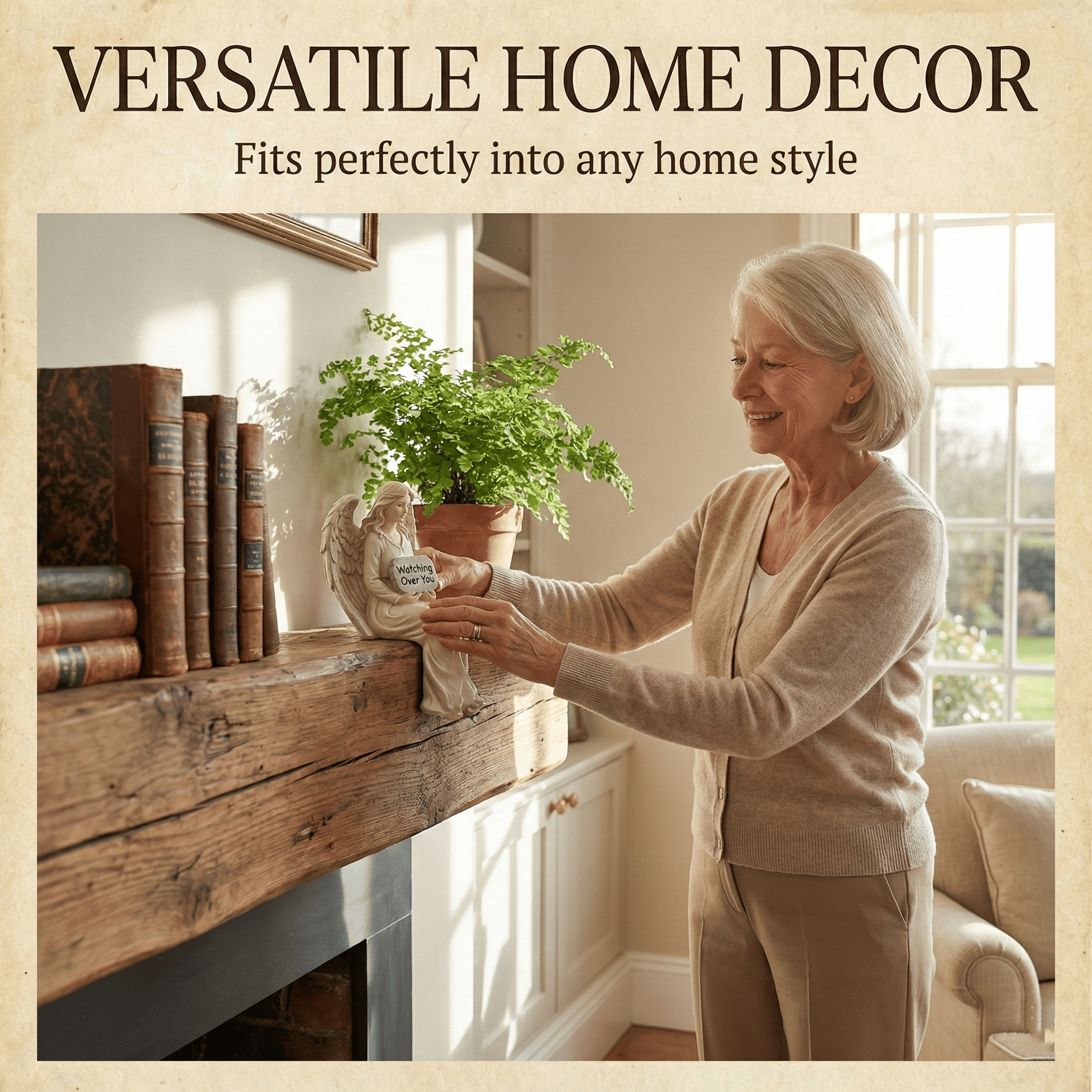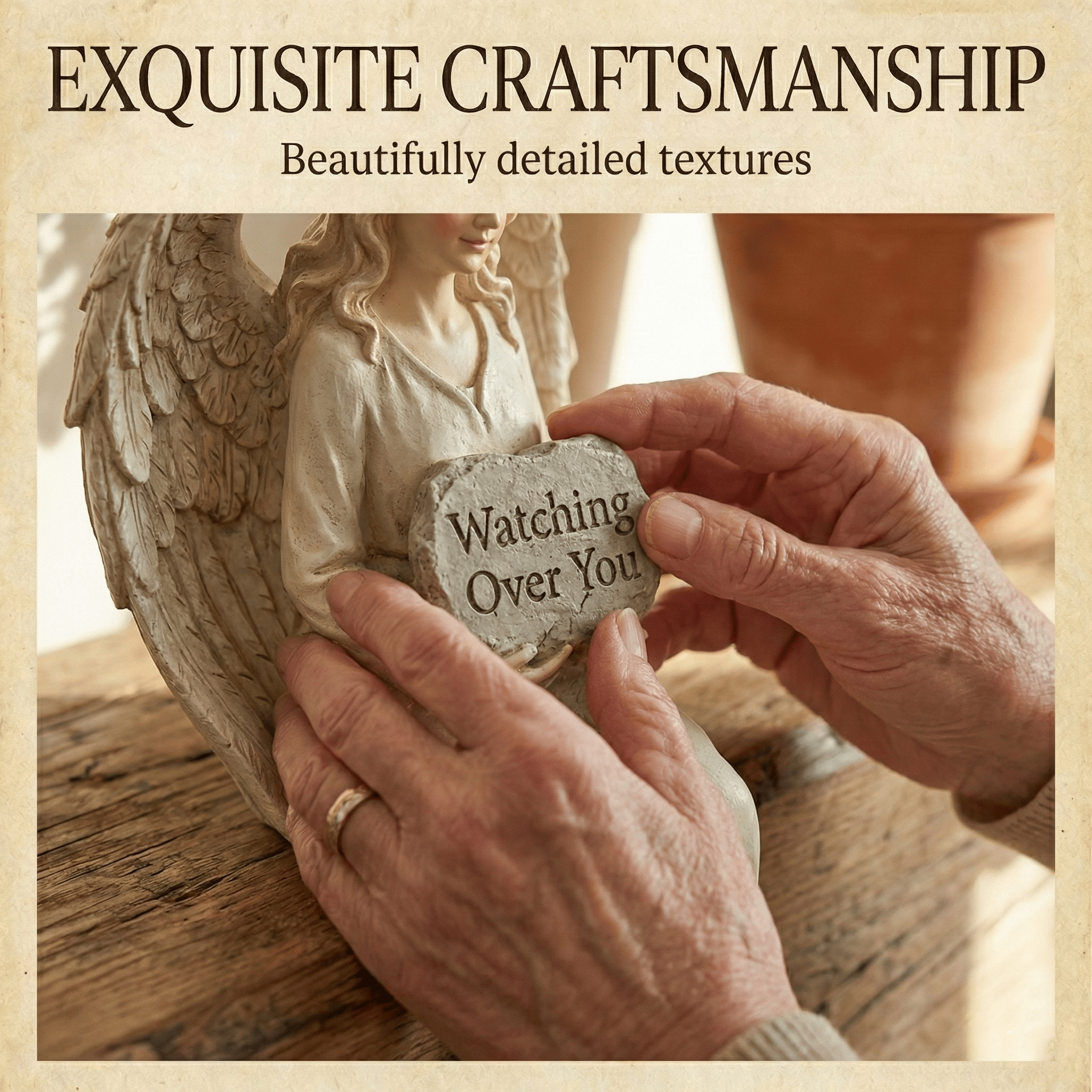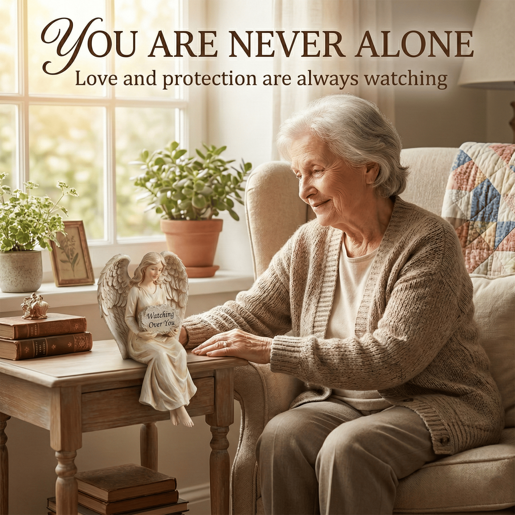 Whether perched on the edge of your computer monitor while you work, sitting on your living room bookshelf, or resting on your bedside table, she is a constant, comforting presence. With her large, detailed wings and a serene expression, she holds a rustic plaque with a simple yet powerful message: "Watching Over You."